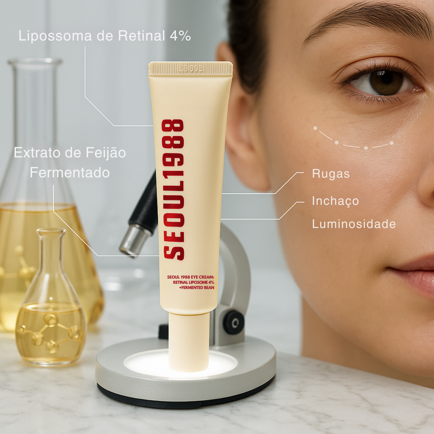 Aplica uma quantidade do tamanho de um grão de arroz do creme Seoul 1988. Espalha suavemente em áreas como contorno dos olhos, pés de galinha, linhas de expressão e testa.